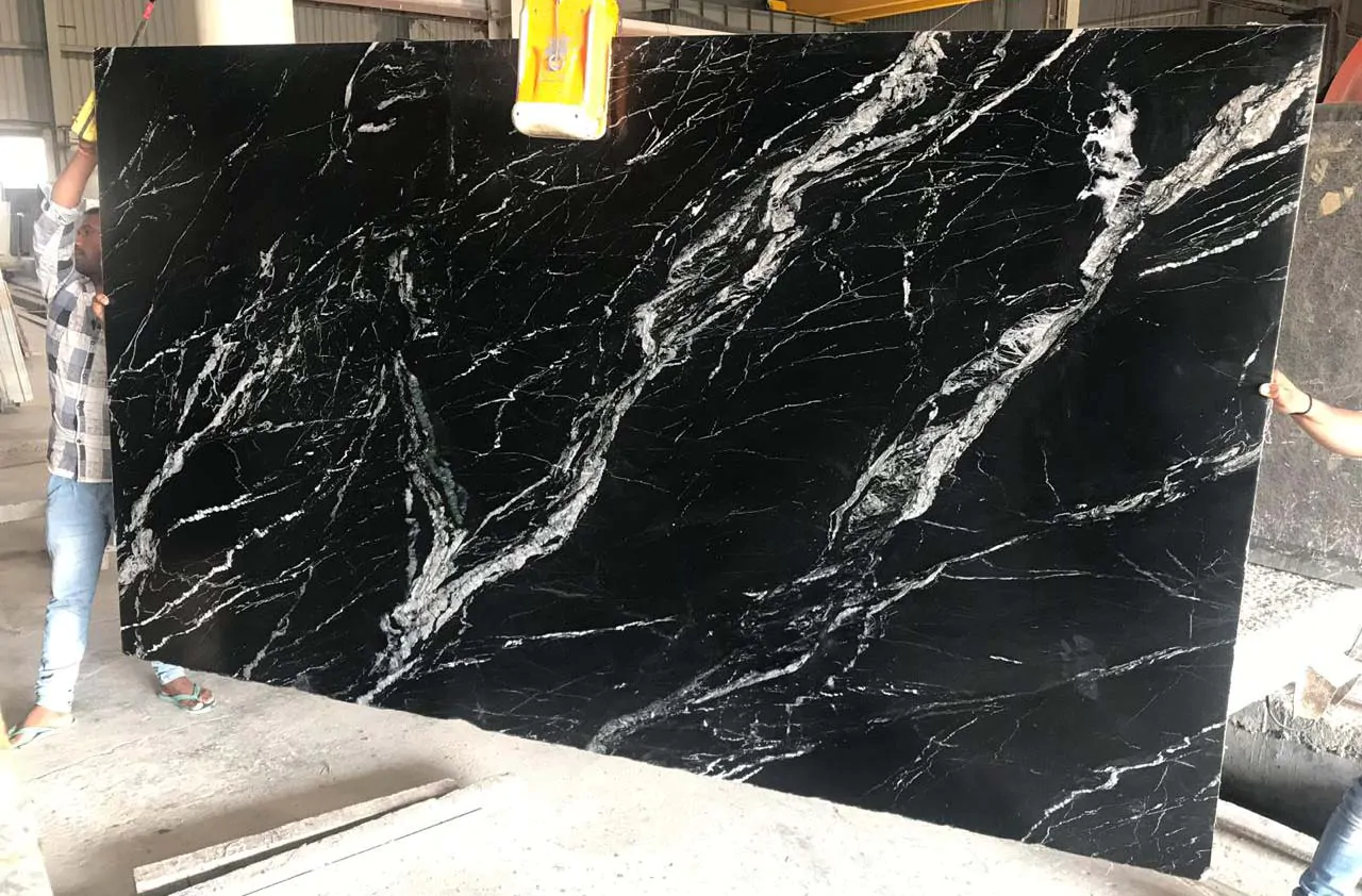 Experience the timeless elegance of our Black and White Marble, a captivating natural stone sourced from the renowned quarries of Rajasthan, India. This marble presents a profound jet-black canvas, artistically streaked with brilliant, meandering white veins. No two slabs are identical, ensuring your space features a one-of-a-kind piece of natural art, perfect for creating a sophisticated and bold statement.